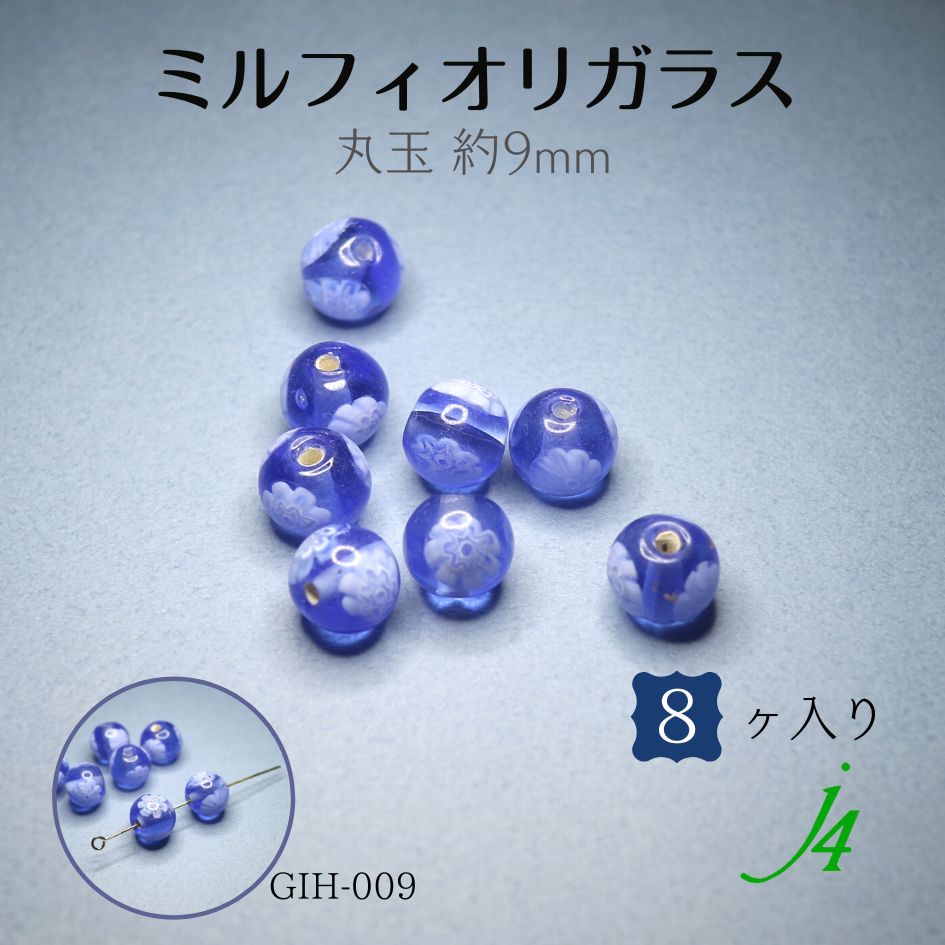 在庫限り!!【 ミルフィオリ ガラス ラウンド ブルー 白花柄入り 約9mm 8ヶ入り ビーズ ショップ j4 】