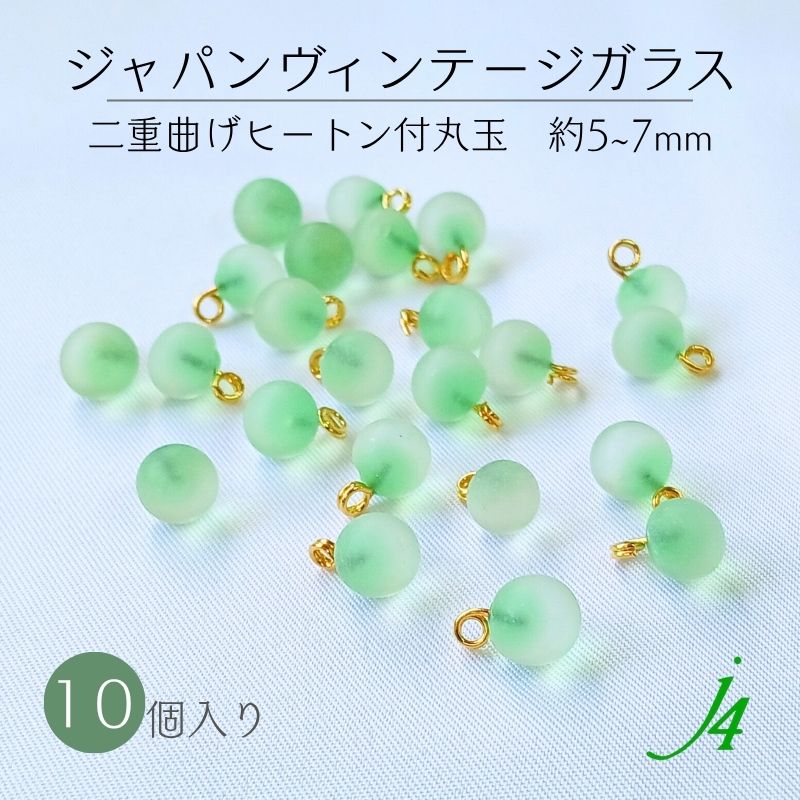 【 ジャパンヴィンテージ ガラス 二重曲げカン付 丸玉 グリーン 約5~7mm 10ヶ入 ビーズ ショップ j4 】