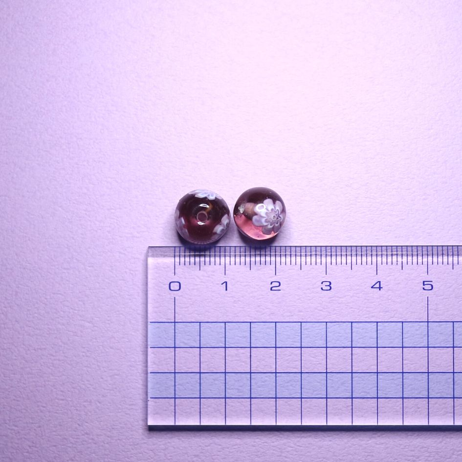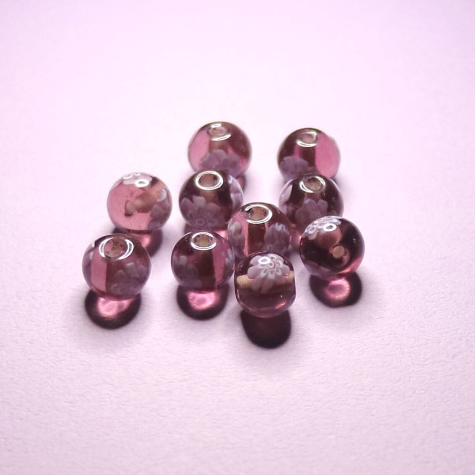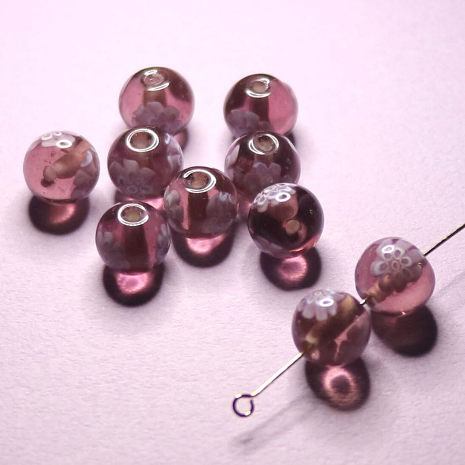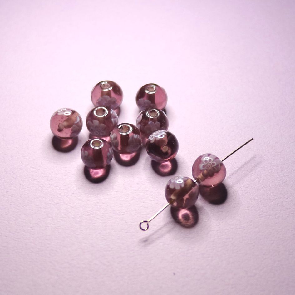 在庫限り!!【 ミルフィオリ ガラス ラウンド ピンク×白花柄入り 約8mm 10ヶ入り ビーズ ショップ j4 】