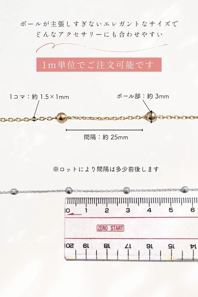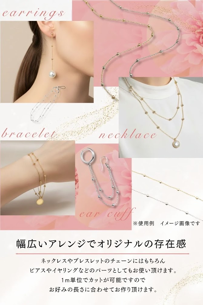 ◆ m単位の切り売りカットチェーン。お好みの長さをご指定ください。 ◆ ネックレスやブレスレット・イヤリングなどアクセサリーだけではなくクラフトの材料など幅広く作品作りにお使いいただけます。 |